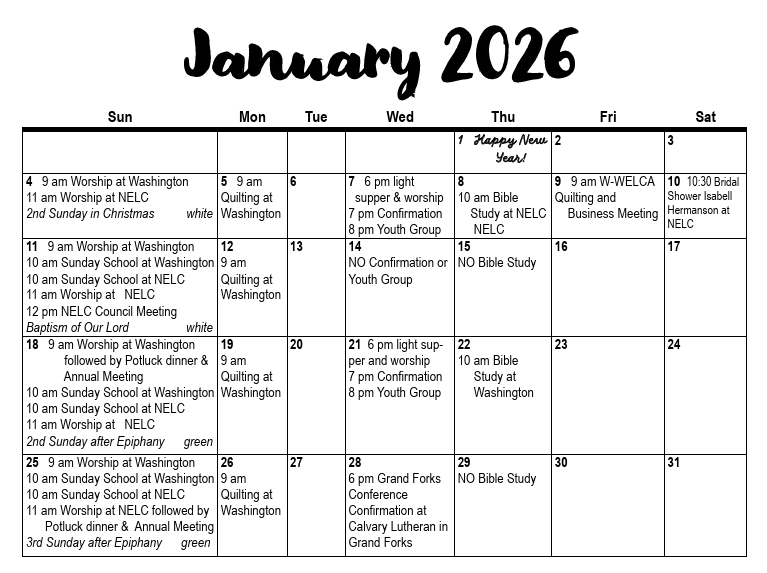 To show our appreciation to both congregations of NELC and Washington, there will be a ham and scalloped potato dinner at NELC following worship, Sunday, February 15.