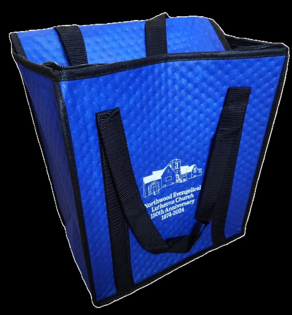 12 in. wide x 8 in. deep x 13 in. tall blue insulated tote bag with carrying straps and zippered top. Poly board insert included.