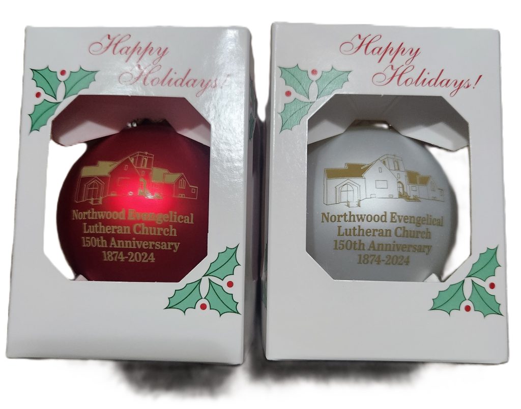 2.5 in. diameter Christmas tree ball. Available in white with gold lettering or red with gold lettering